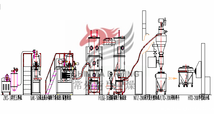 此次出口柬埔寨成套制粒联动线设备包含高速混合制粒机(含KZL-300)、沸腾制粒机、喷嘴制粒系统等。(下图为制粒联动线设计方案参考图)